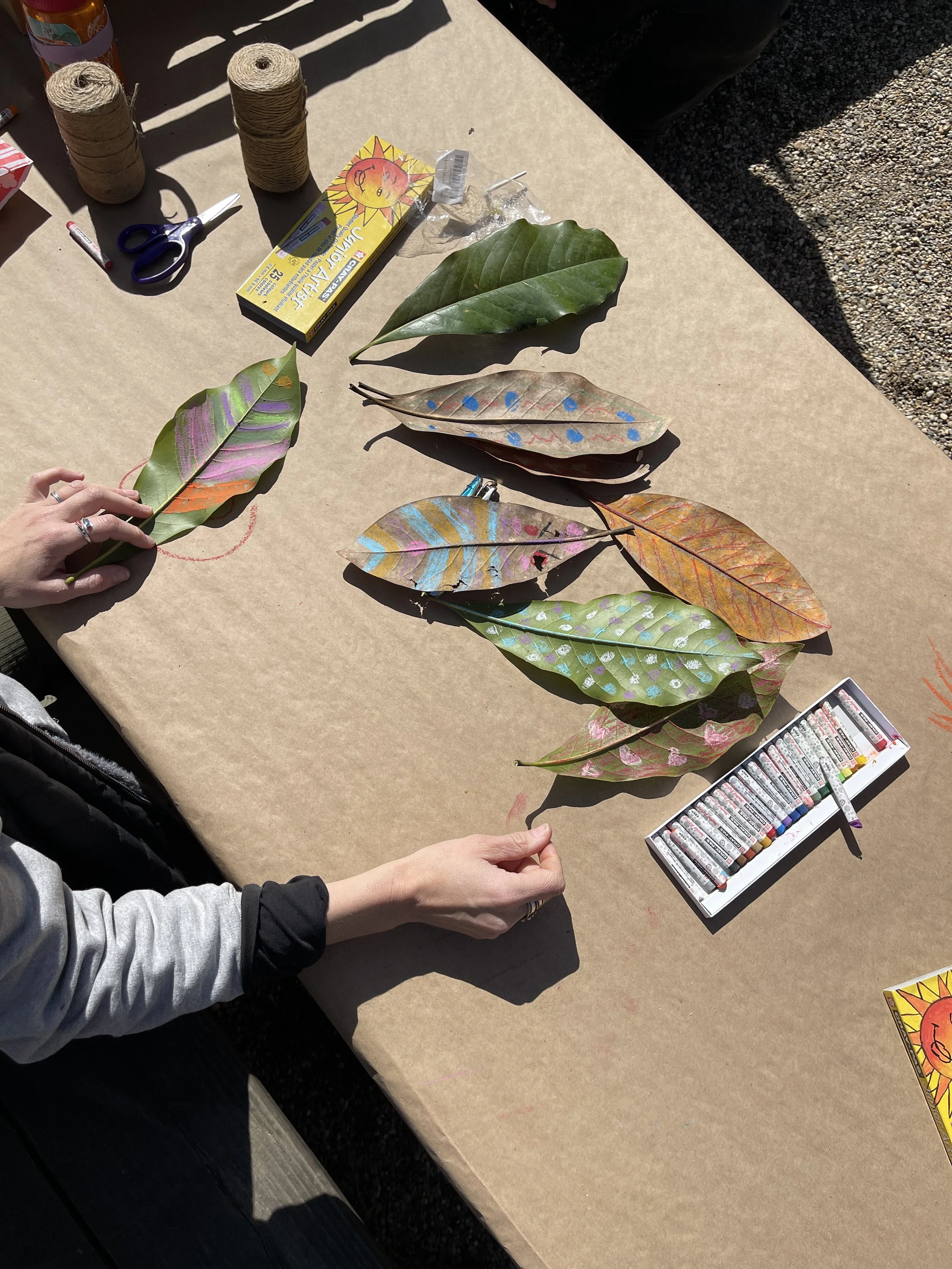 Decorative leaves laid out on a table for an art craft project, with markers, jute twine, scissors, and boxes of pastel crayons nearby.