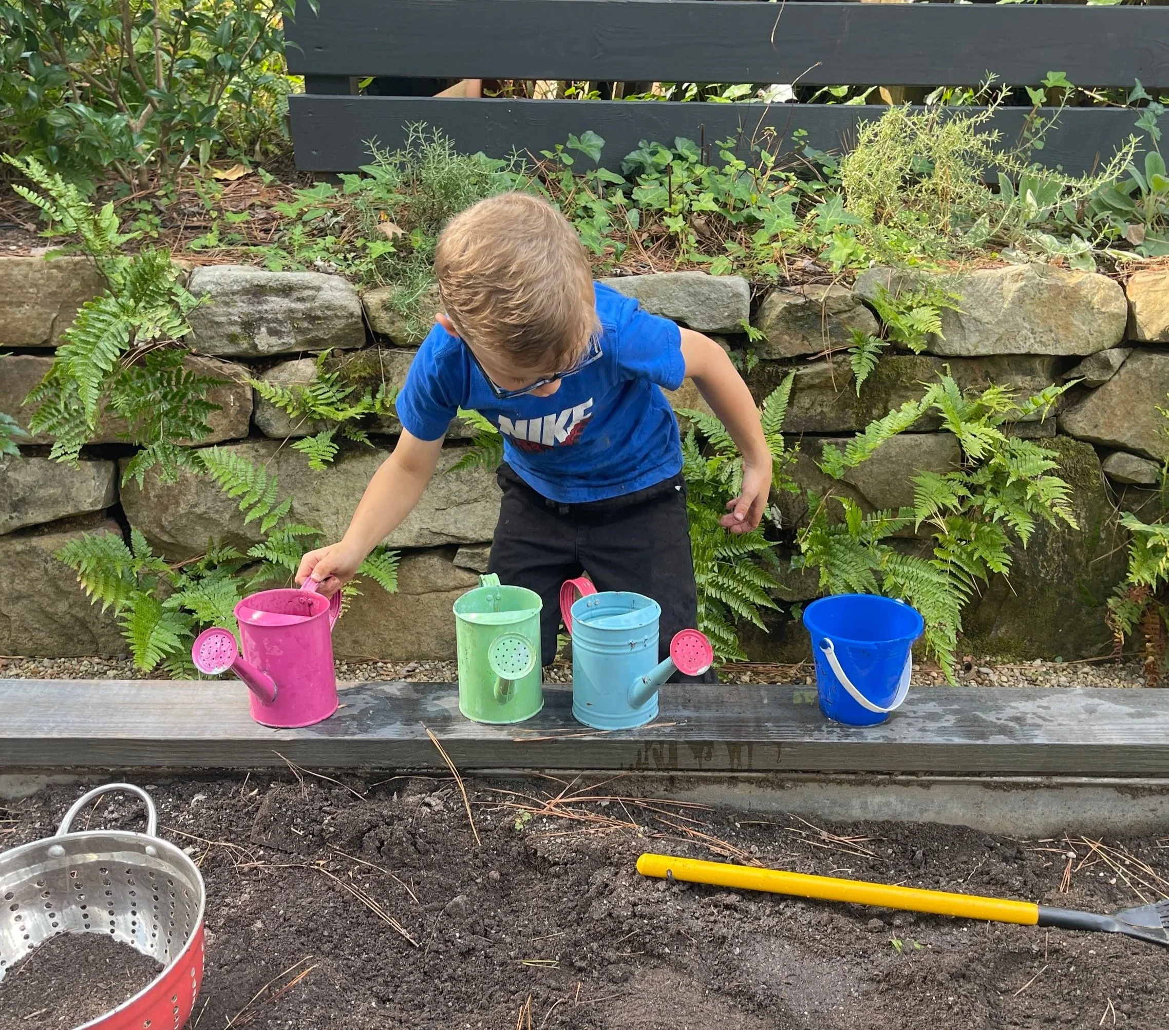 A young boy with glasses in a blue t-shirt and black pants watering plants with colorful watering cans on a garden bed.